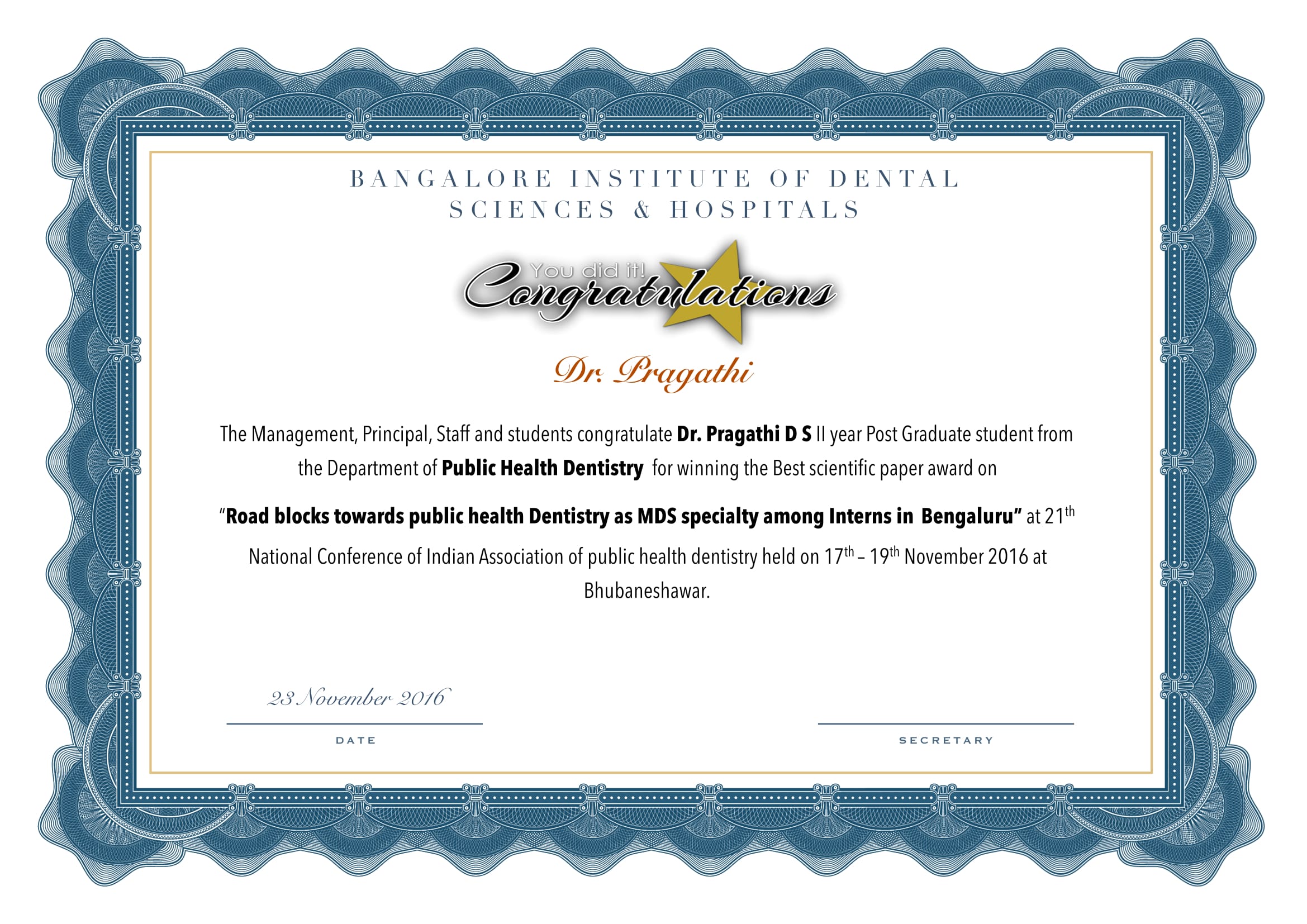 The Management, Principal, Staff and students congratulate Dr Kotecha Ankita Kiritkumar, Faculty Department of Periodontology for Securing first rank in examination conducted by Rajiv Gandhi University of Health Sciences Karnataka , Bangalore, August 2016.